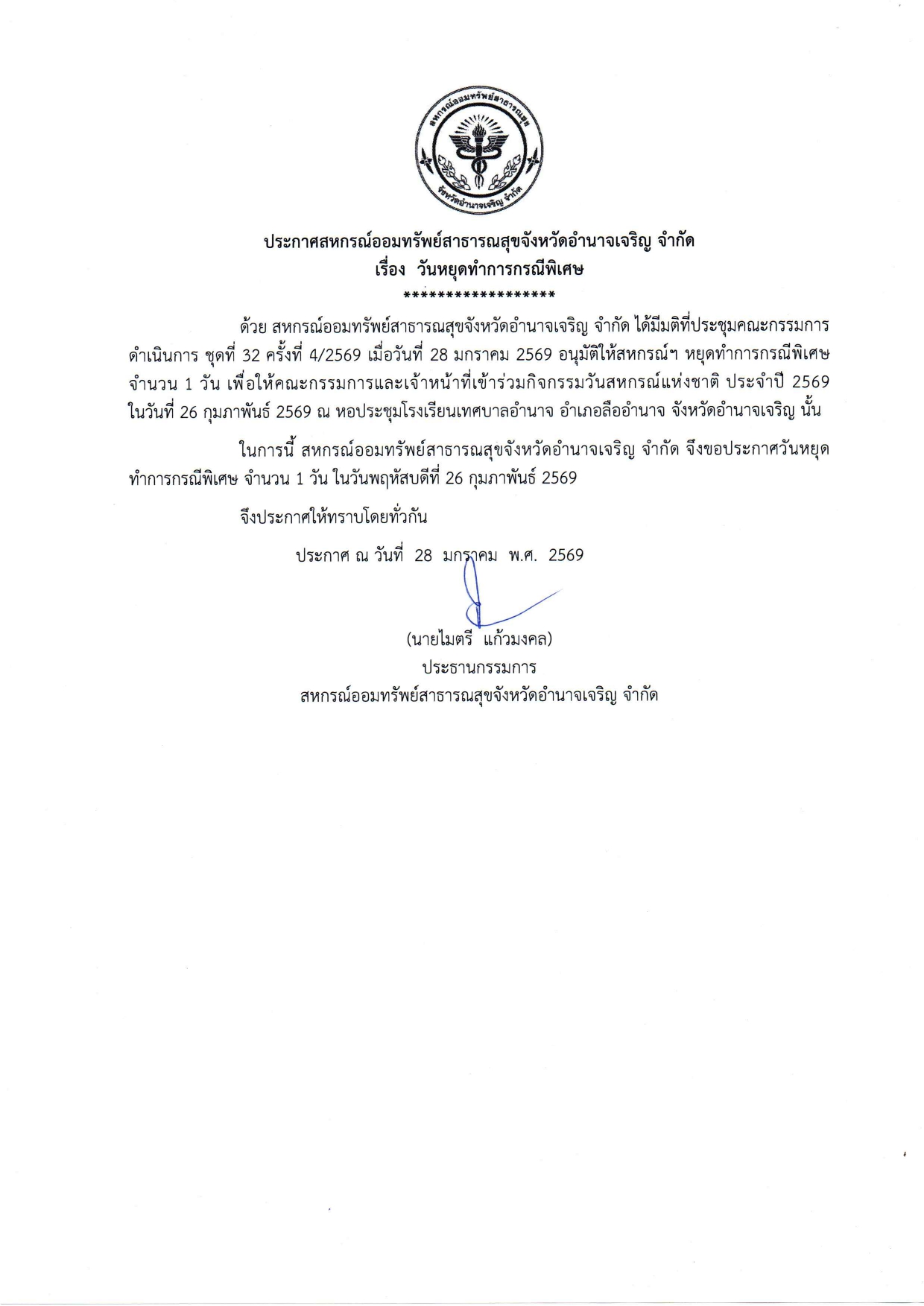 ประกาศ วันหยุดทำการกรณีพิเศษ ในวันที่ 26 กุมภาพันธ์ 2569 เนื่องในวันสหกรณ์แห่งชาติ