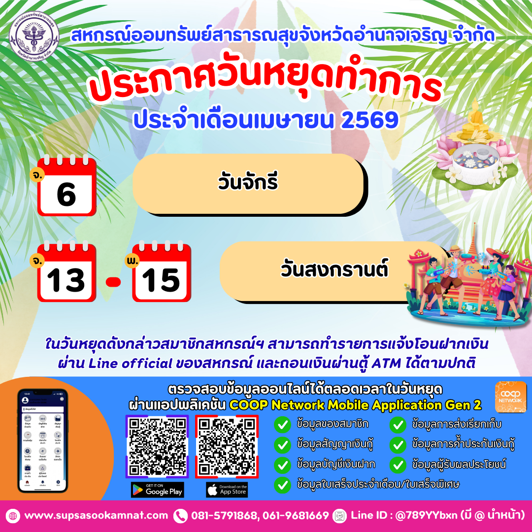 ประกาศวันหยุดทำการ ประจำเดือนเมษายน 2569