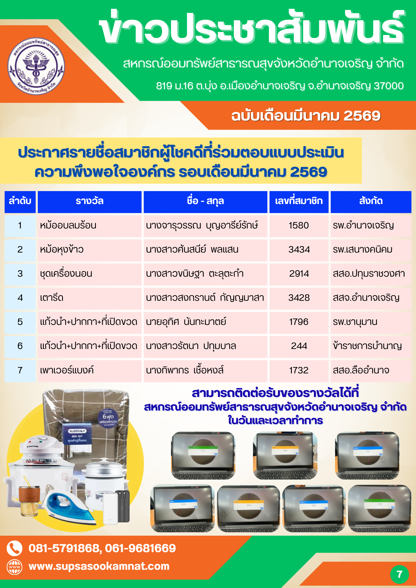 ประกาศรายชื่อผู้โชคดีได้รับรางวัล ประจำเดือนมีนาคม 2569