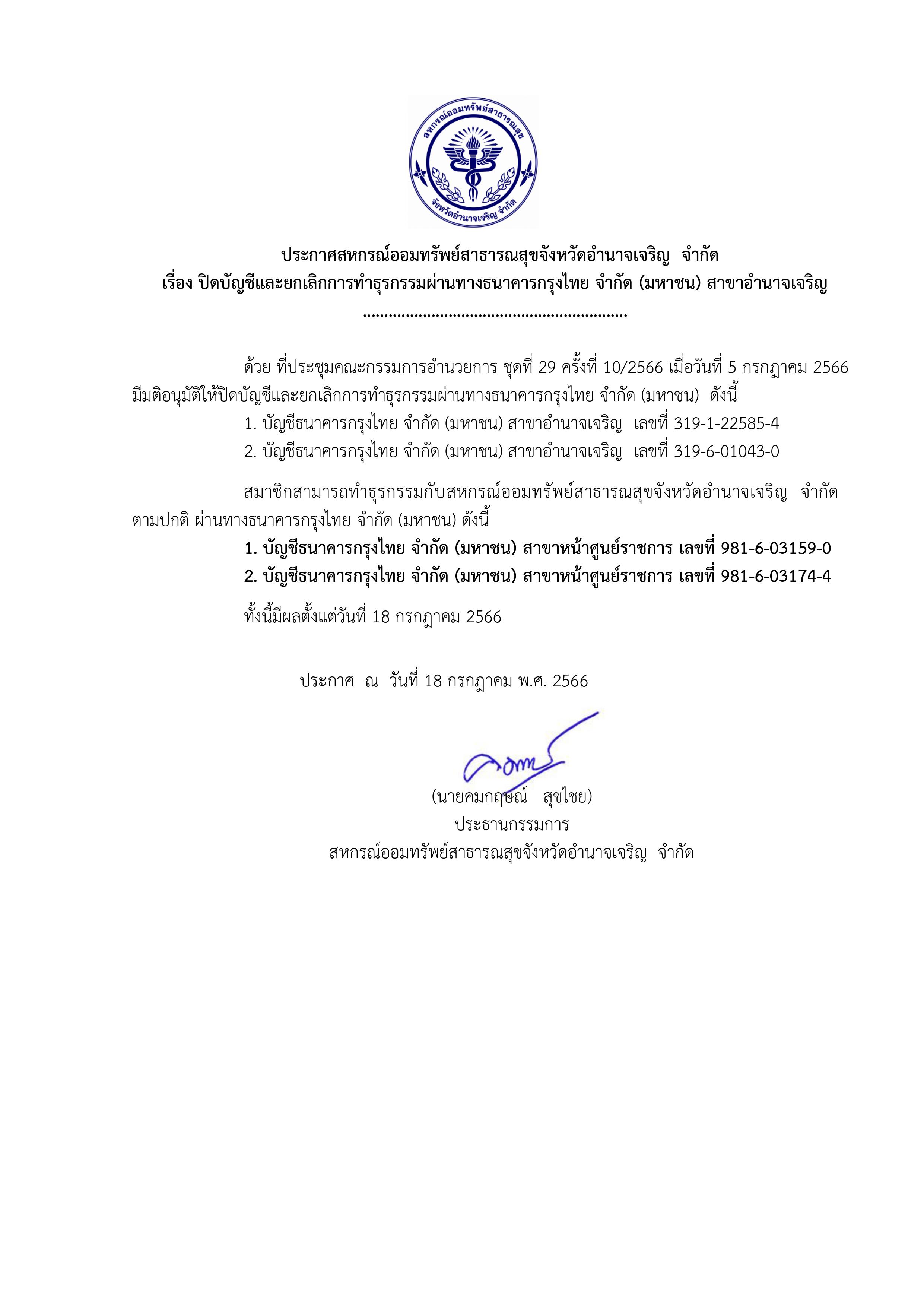 ประกาศ ปิดบัญชีและยกเลิกการทำธุรกรรม ธ.กรุงไทย สาขาอำนาจเจริญ