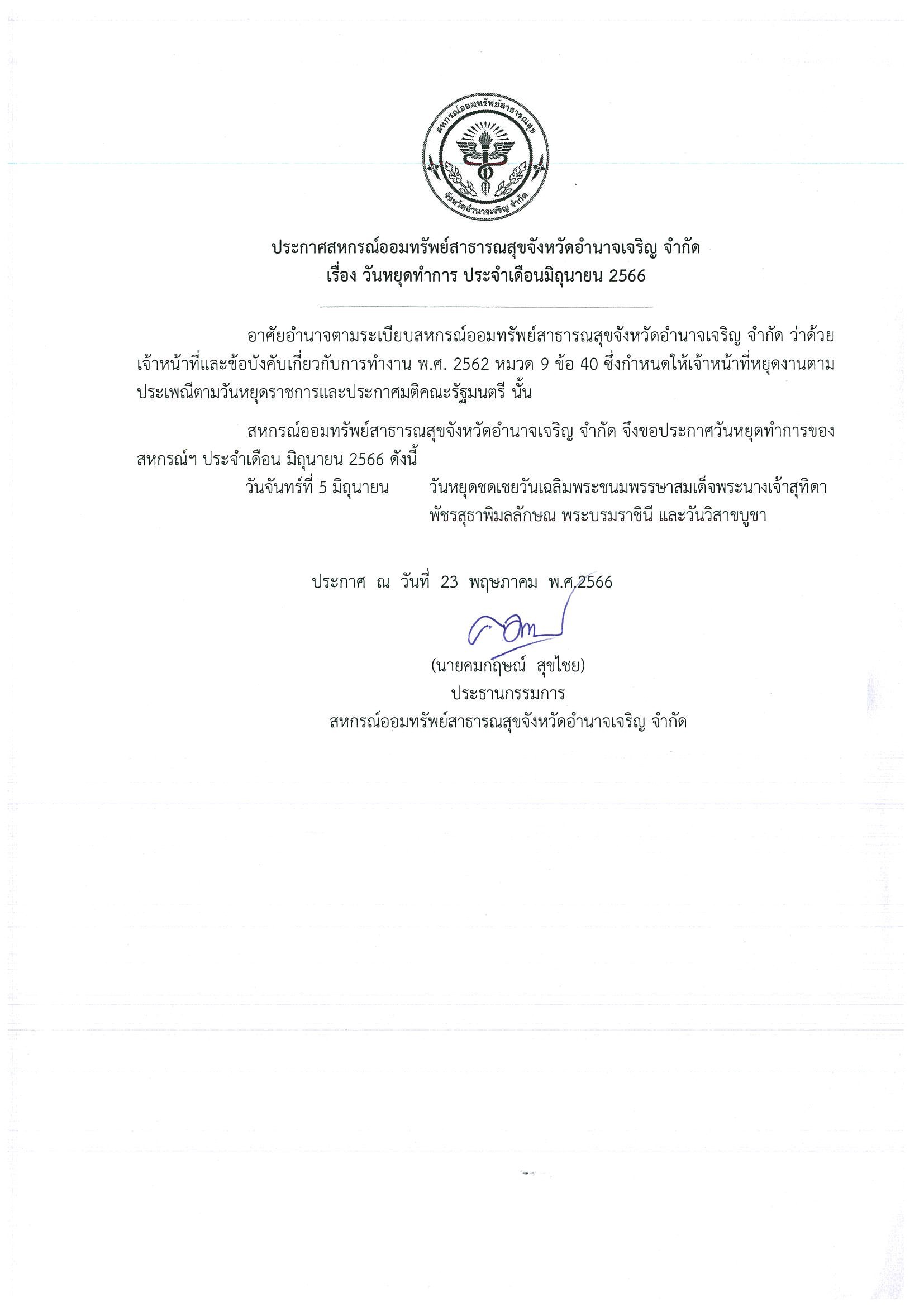 ประกาศ วันหยุดทำการประจำเดือนมิถุนายน 2566