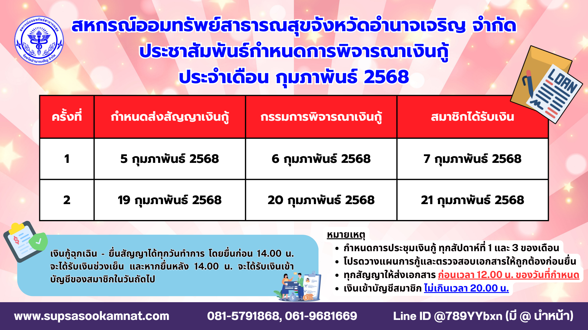 ตารางกำหนดการพิจารณาเงินกู้ ประจำเดือนกุมภาพันธ์ 2568