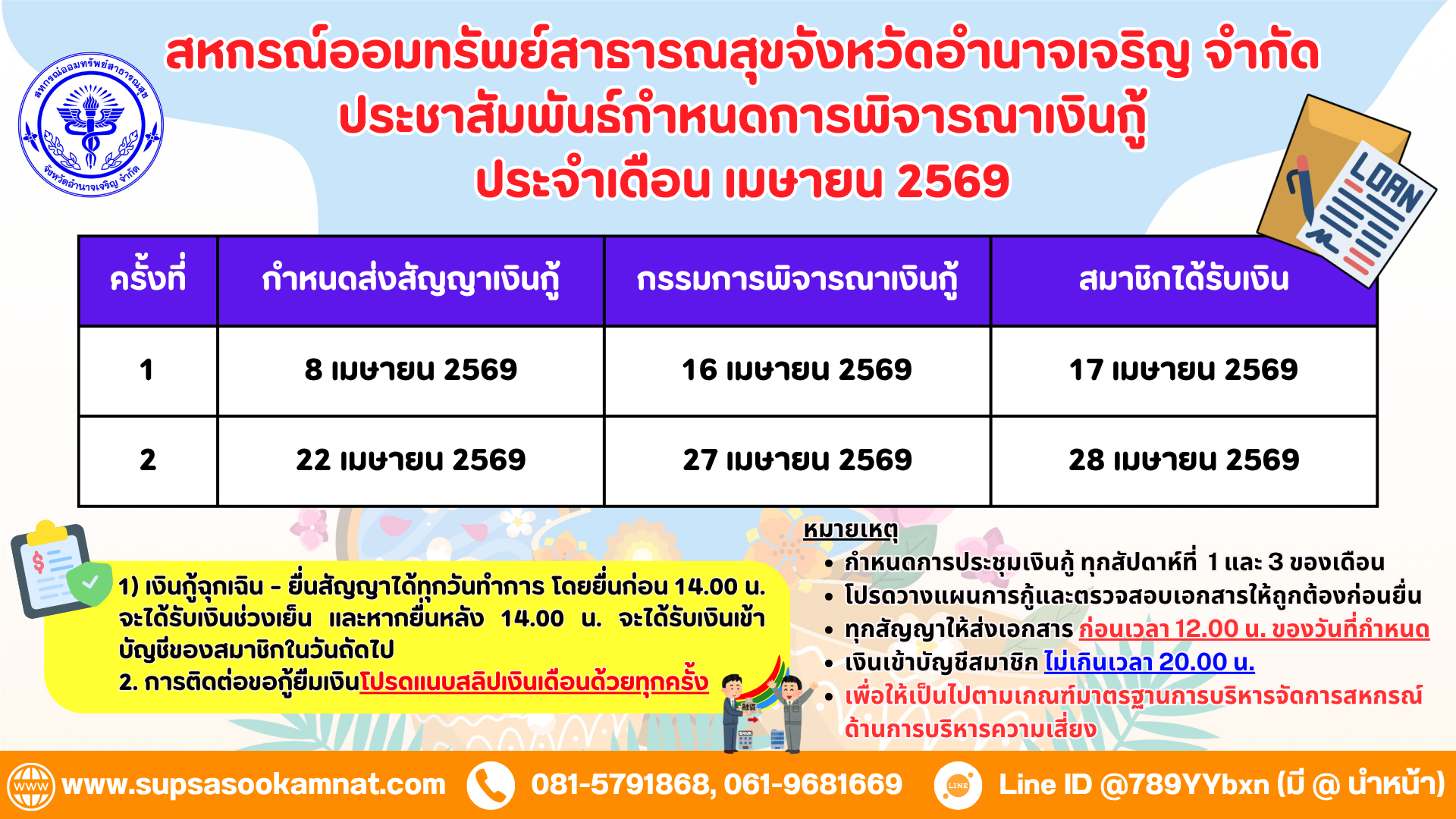 ตารางกำหนดการพิจารณาเงินกู้ ประจำเดือนเมษายน 2569