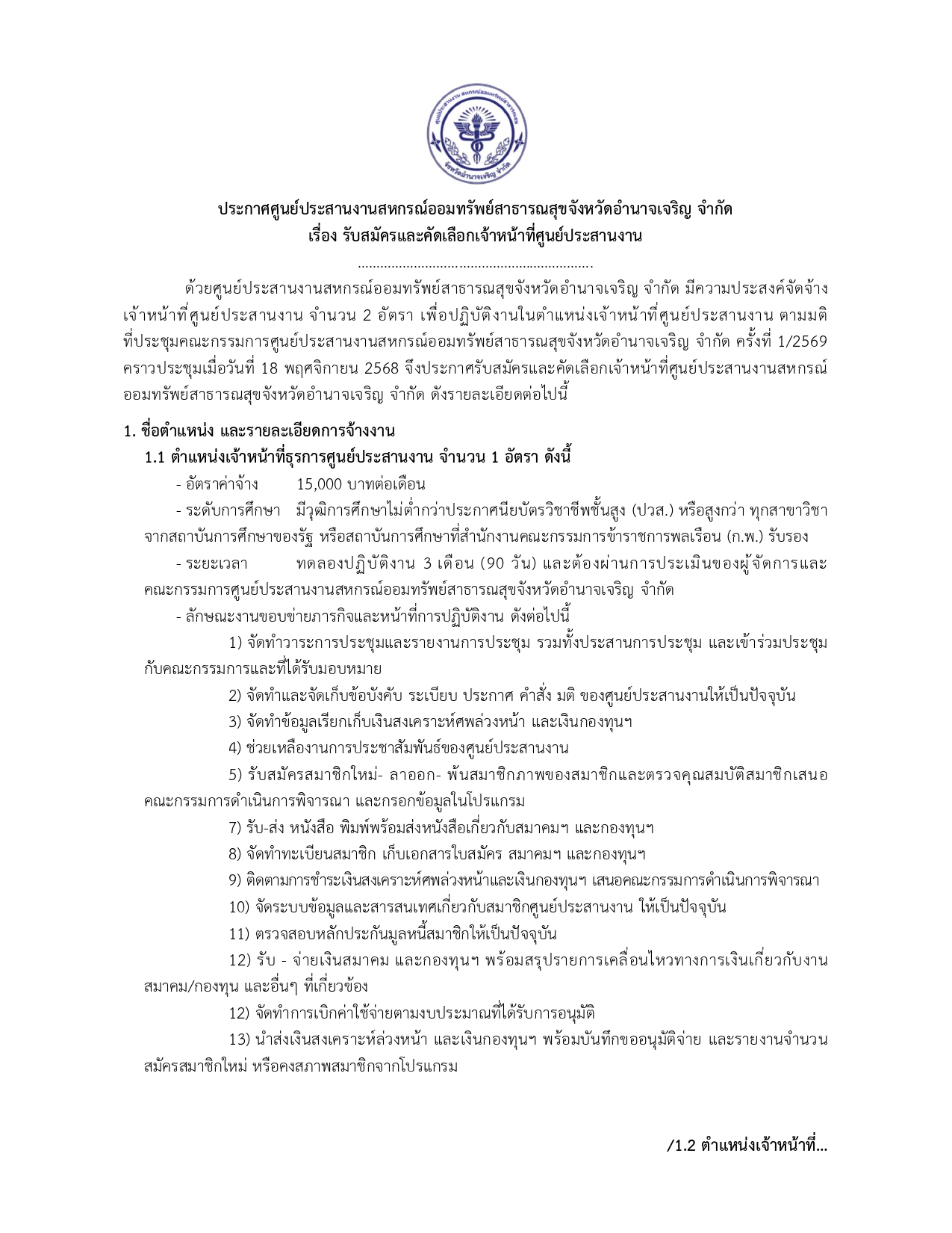 เปิดรับสมัครตั้งวันนี้ - 19 ธันวาคม 2568 (ในวันและเวลาทำการ) 1) เจ้าหน้าที่ธุรการศูนย์ประสานงานฯ จำนวน 1 ตำแหน่ง เงิ...